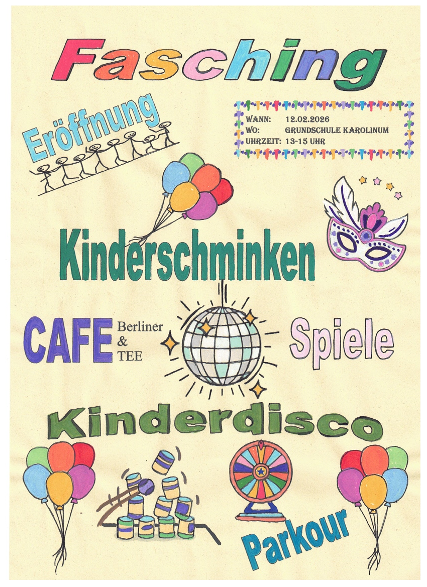 unsere Schule feiert am Donnerstag, den 12.02.2026 in der Zeit von 13.00-15.00 Uhr Fasching